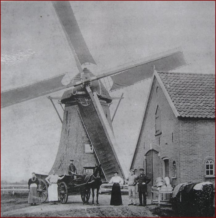 De familie Hendrik Jan Nijendijk, rond 1915.Voor de molen, v.l.n.r. de huishoudelijke hulp, de bakkersknecht, de voerman-molenaar Tichelman, de kinderen Riek en Jannes en vader Hendrik Jan Nijendijk zelf.
